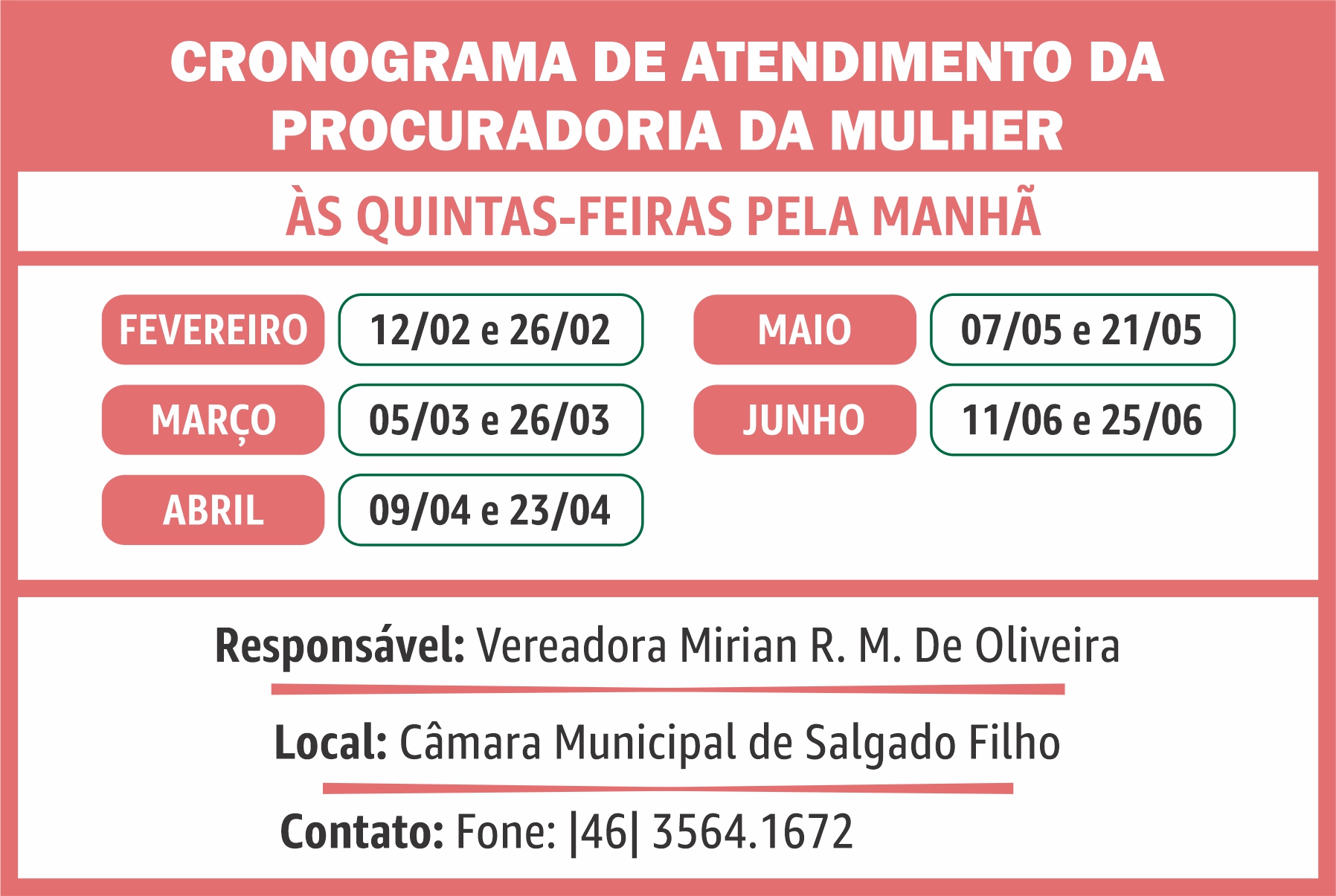 A Procuradoria também atua na promoção de políticas públicas voltadas à saúde da mulher, reforçando o compromisso do município com o bem-estar e a dignidade feminina. Para solicitar auxílio ou obter mais informações, a população pode entrar em contato por meio do e-mail camarasalgado@hotmail.com, pelo telefone (46) 3564-1672, ou comparecer pessoalmente à secretaria da Câmara Municipal, localizada na Rua Rui Barbosa, nº 60, Centro. Outras informações estão disponíveis no site institucional:https://camarasalgadofilho.pr.gov.br