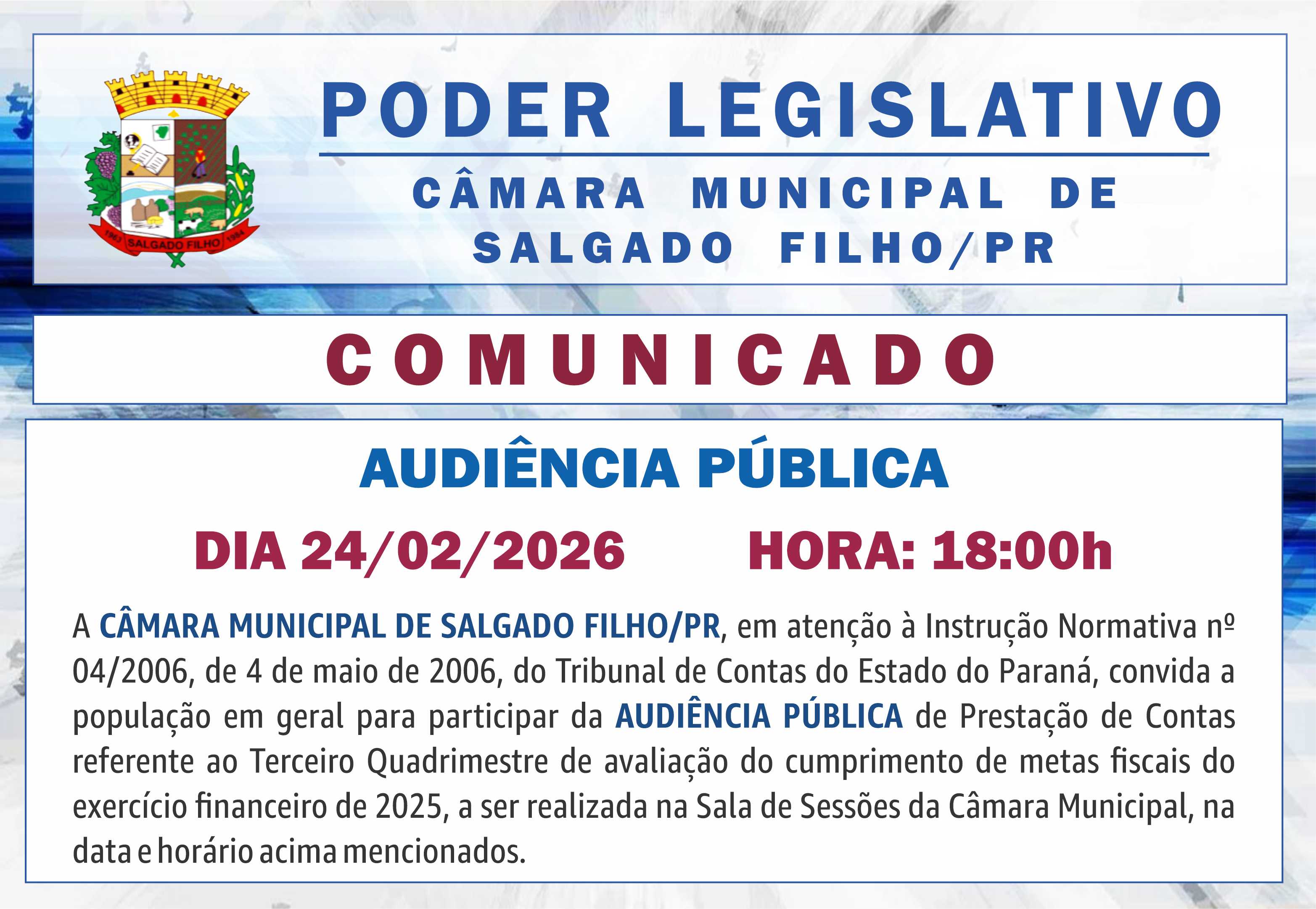 AUDIÊNCIA PÚBLICA DE PRESTAÇÃO DE CONTAS DO 1º QUADRIMESTRE DE 2025 - CLIQUE AQUI E LEIA A MATÉRIA